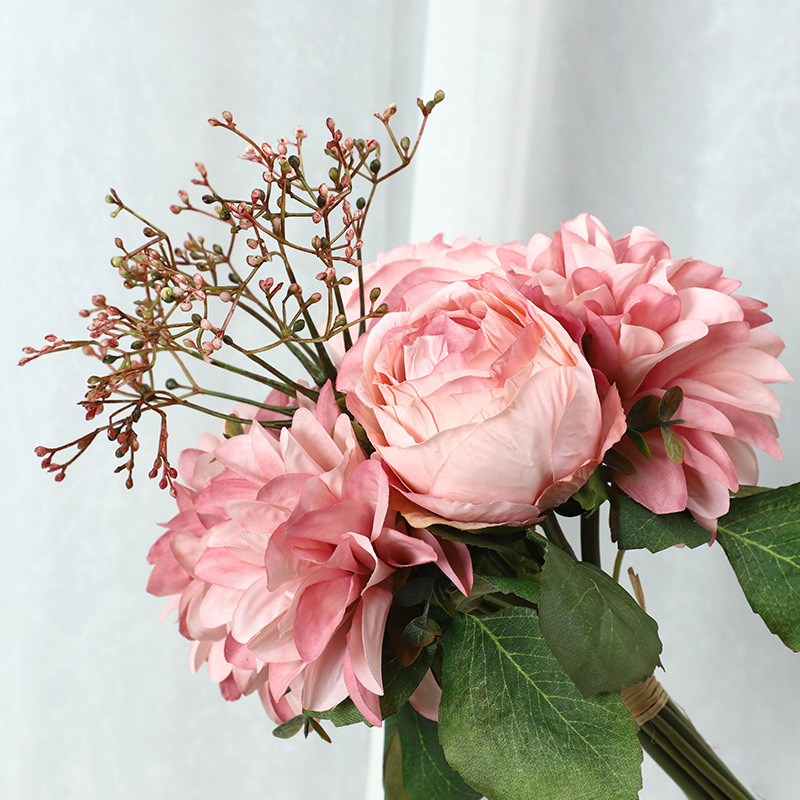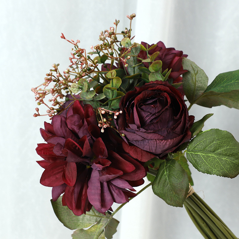 The bouquet consists of 10 stems—featuring 3 open blooms and 2 buds—along with 4 stems of eucalyptus and 1 cluster of baby’s breath. The dahlias measure 10 cm in diameter, while the roses measure 7 cm; the arrangement also includes 5 clusters of foliage, totaling 15 leaves.